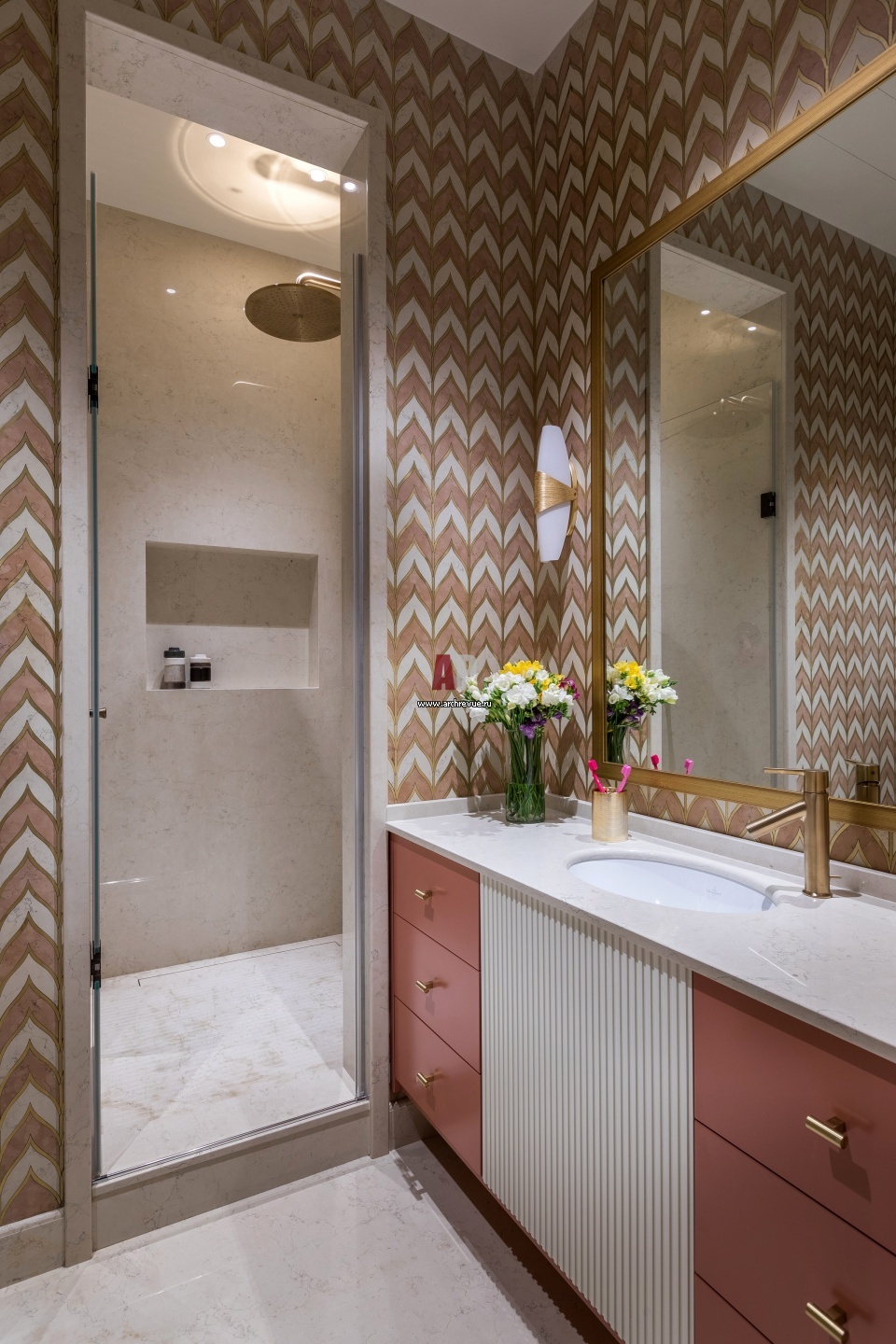 Детский санузел исполнен в светлых тонах. На стенах – мраморная мозаика (Rosso Perlino и Bianсo Perlino) с латунными вставками, она выполнена на заказ. Тумба под раковины по эскизам дизайнера исполнена в теплом кораллово-персиковом оттенке.