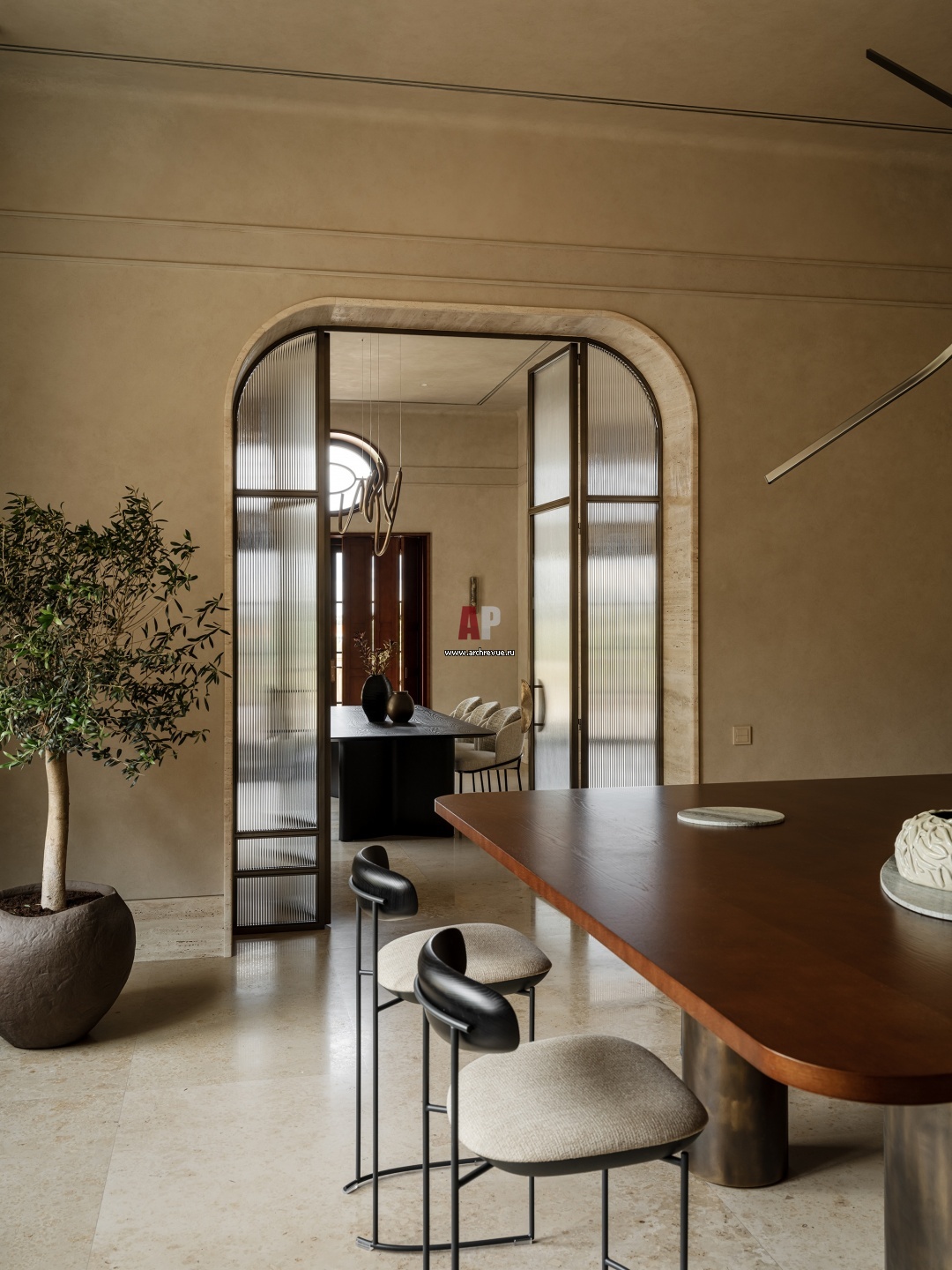 Главное украшение кухни – большой шпонированный остров с радиусными углами и массивными подстольями из патинированной латуни. Также на столешнице есть вставки из мрамора Ocean Green, которые являются не только декоративными элементами, но и выполняют функцию подставок для еды во время фуршетов.