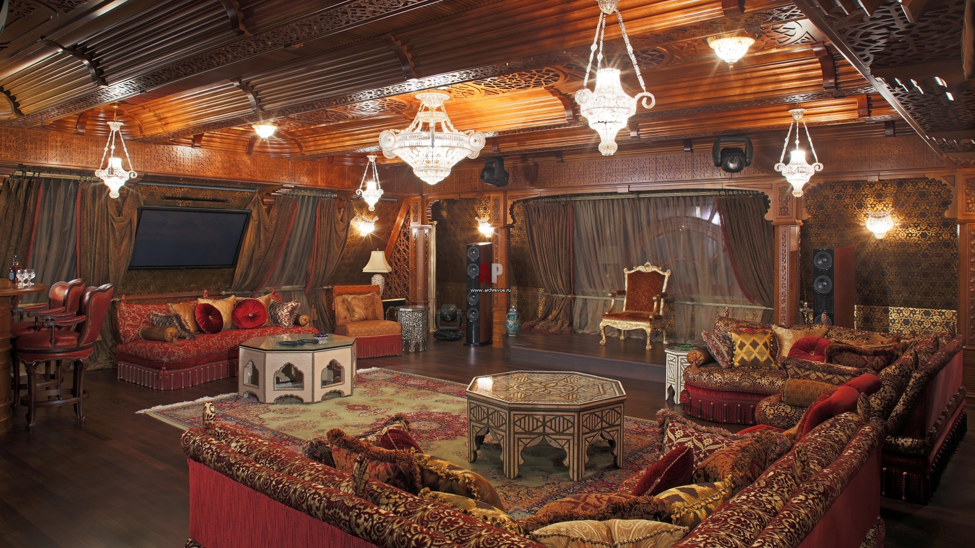 Кинозал в пышном восточном стиле. Потолки, колонны зашиты деревянными панелями с восточной резьбой.