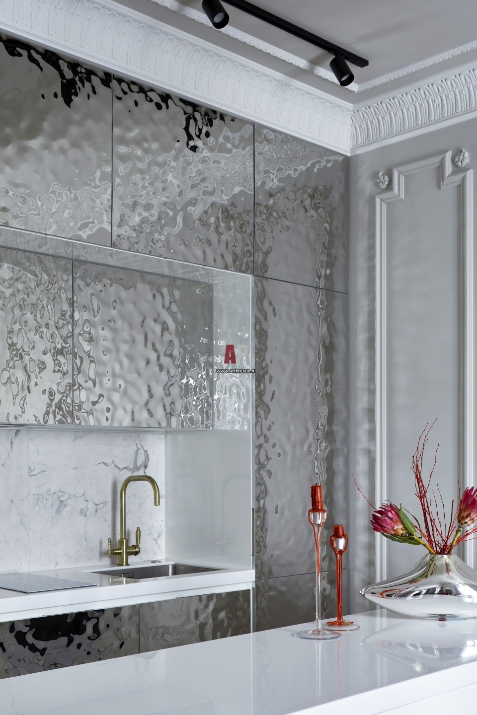 Кухня с фасадами из рельефного металла сделана по чертежам автора проекта. Дверцы оснащены скрытыми ручками, они утоплены в торцах, благодаря чему при открытии на поверхностях не остается отпечатков пальцев.
