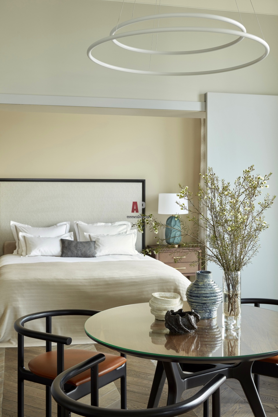 В несущей стене между гостиной и спальней был согласован проем и установлены раздвижные двери, выкрашенные в цвет стен. На столе - авторская керамика Елены Пиковской.