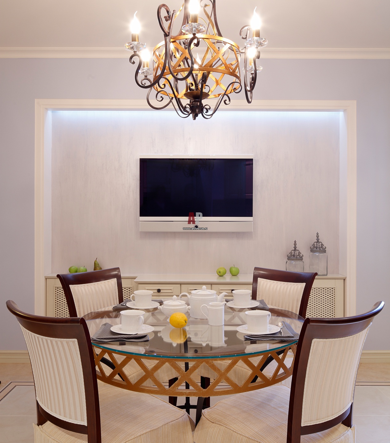 Используя площадь кухни, автор выделяет пространство столовой зоны. Кроме ансамбля обеденного стола и расположенной над ним люстры с кованым орнаментом, здесь расположились комод для посуды и ТВ