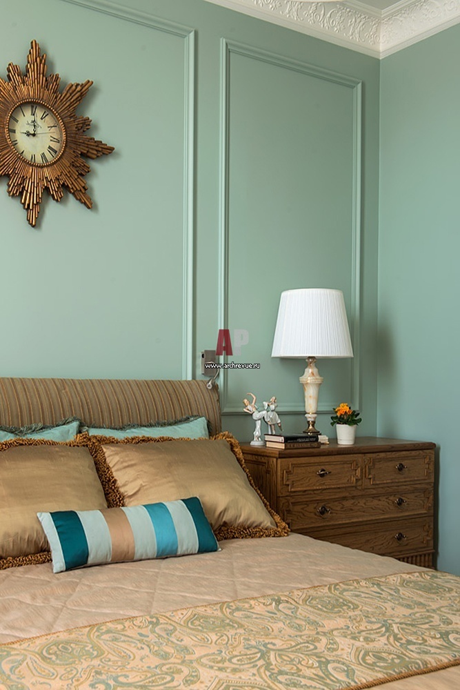 Лепная раскладка за изголовьем кровати в спальне – классический декоративный прием, характерный для дворцовых интерьеров.
