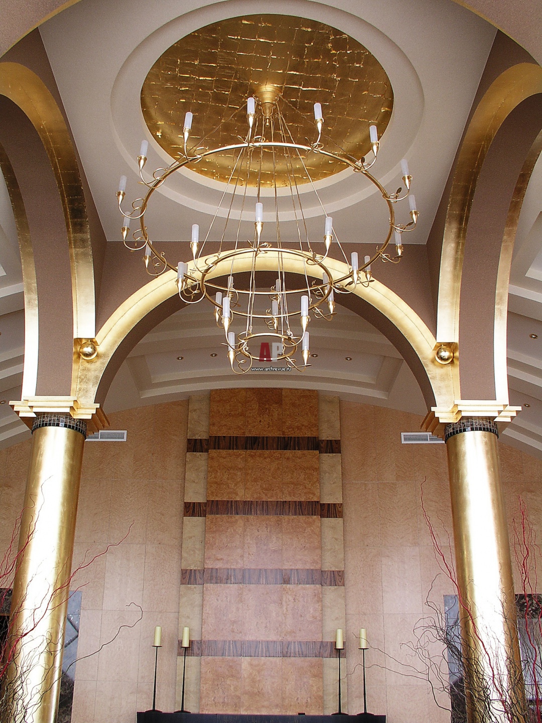 Купол и колонны превращены архитектором в импровизированную ротонду. Потолок отделан сусальным золотом.