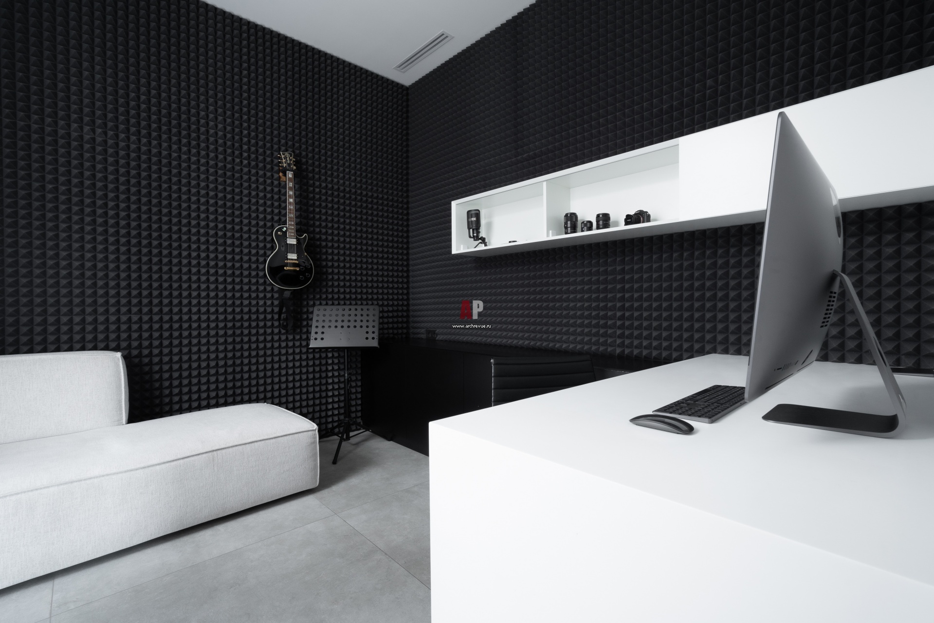 Черно-белый кабинет, он же музыкальная студия, оформлен 3D-панелями с акустическим эффектом.