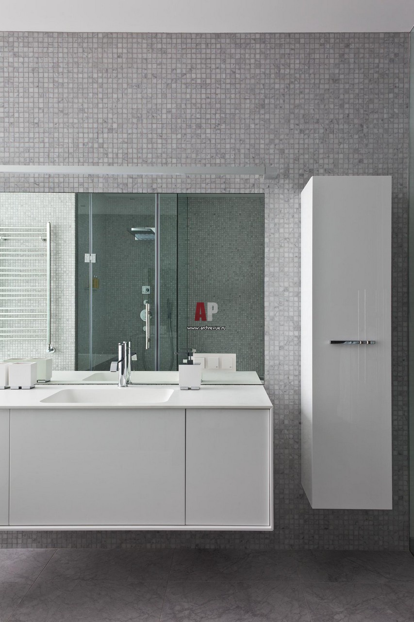 Интерьер ванной комнаты решен в стиле минимализм. Сантехника, Antonio Lupi. Смесители, Newform. Стены вокруг умывальника облицованы каменной мозаикой.
