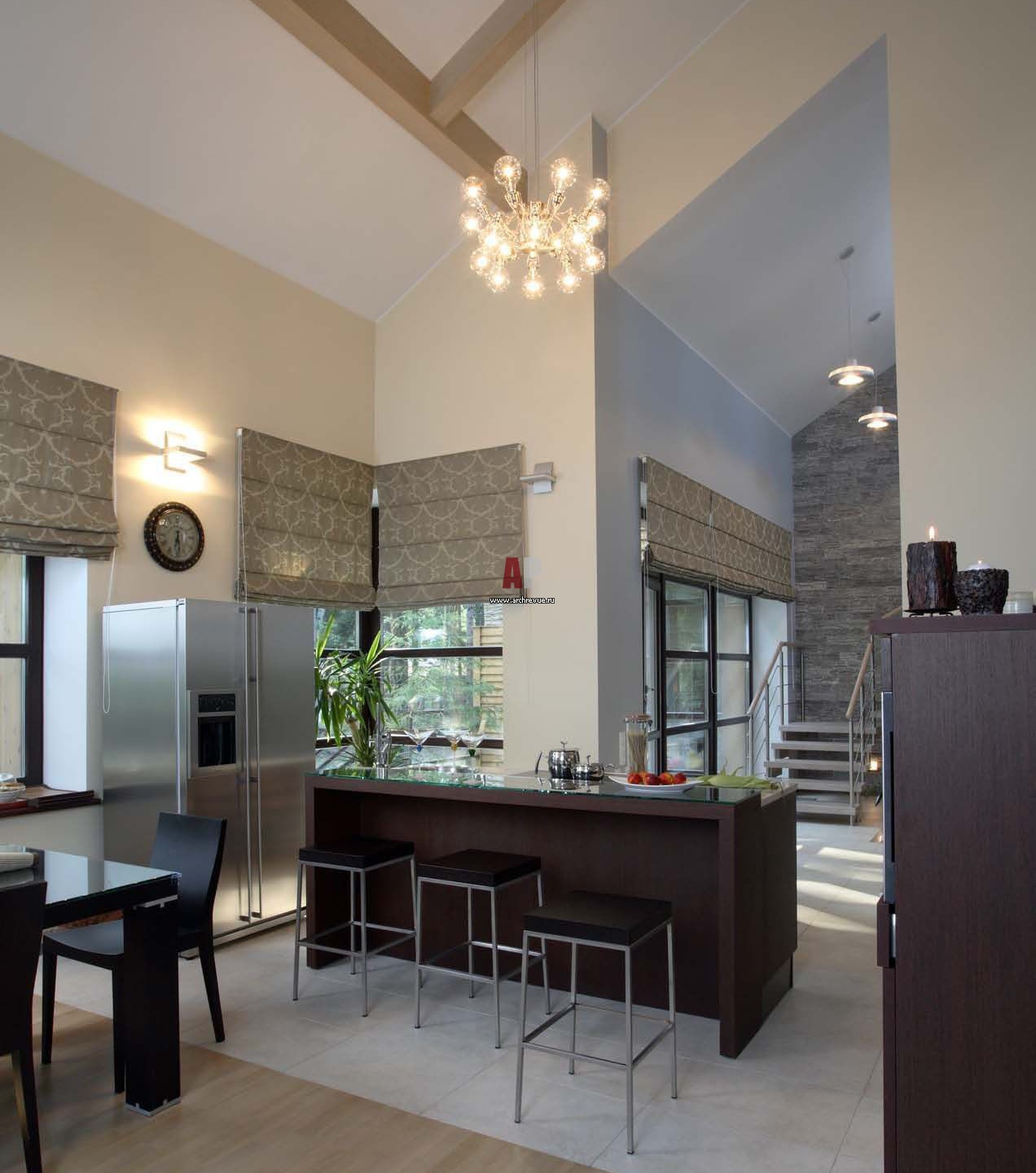 Общественная зона исполнена в современном стиле с обилием света и воздуха. Графичность интерьеру придает лаконичная кухонная мебель из темного дерева, поставщик «Два дома».