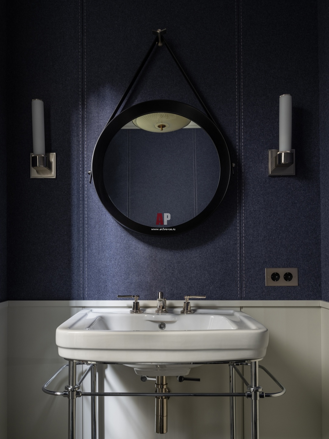 Гостевой санузел. Панели из сукна темного фиолетового оттенка стали хорошим фоном для зеркала, светильников и белоснежного фаянса сантехнического оборудования.