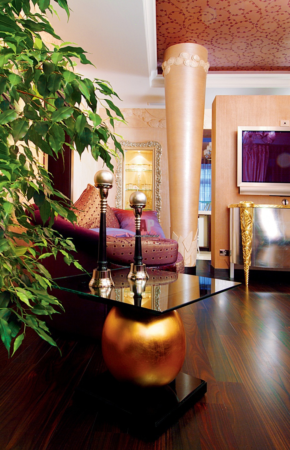 Гостиная исполнена в лавандовых и насыщенных винно-сливовых цветах. Помещение по периметру оформлено декоративным лепным фризом с цветочным узором. На стенах – многослойная декоративная штукатурка с перламутром.