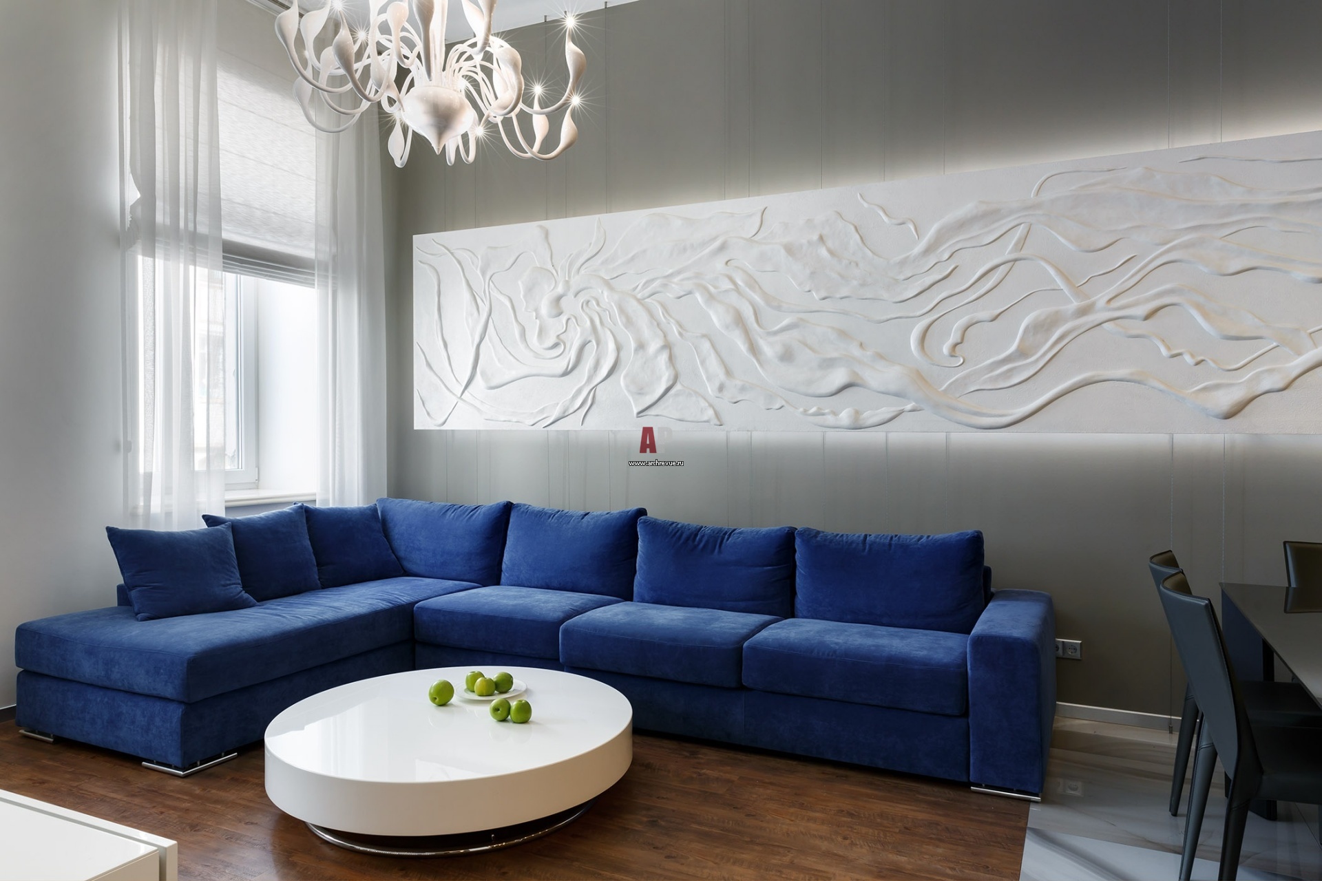 Пространство гостиной организовано крупными плоскостями и формами (масштабные лепные панно, массивный угловой диван, зеркальные поверхности, круглый лакированный журнальный столик) и строится на контрасте однотонных серых стен, синей обивки дивана и деревянных поверхностей.