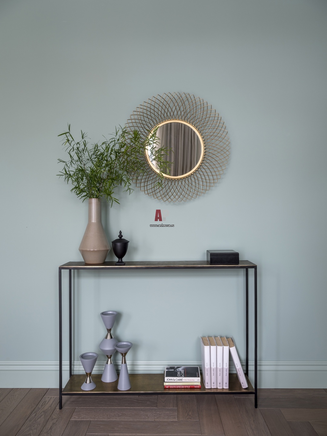 Стены и плинтусы в гостиной выкрашены в пастельный бирюзовый цвет. Краска, Sherwin-Williams. Консоль, рама зеркала сделаны из латуни.
