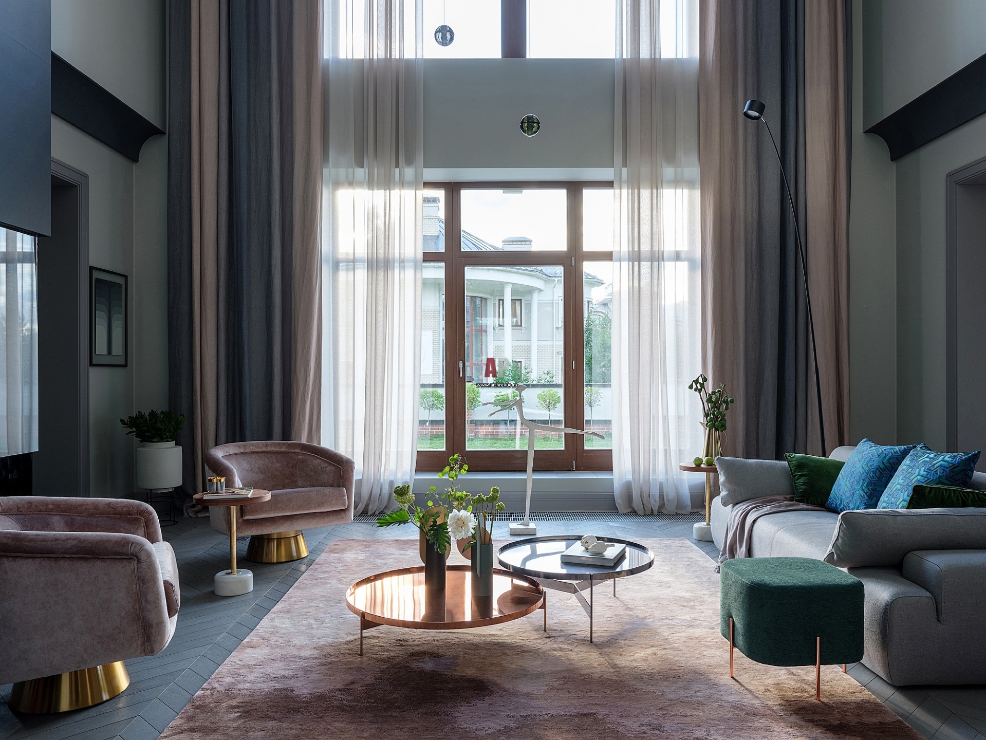 Интерьер гостиной. Столики, Pianca. Диван, Meridiani. Кресла, Jonathan Adler. Пуф, Sancal.