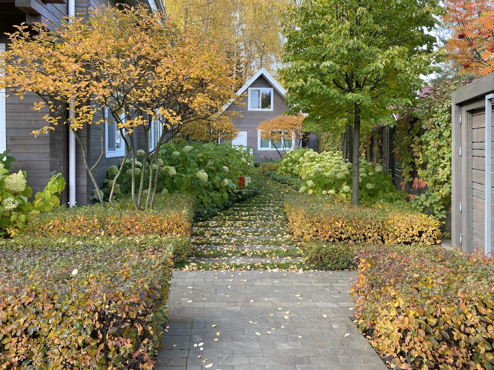 Вдоль забора высажены липы европейские. На переднем плане – стриженные изгороди из кизильника блестящего и спиреи японской. На дальнем – массивы гортензий.