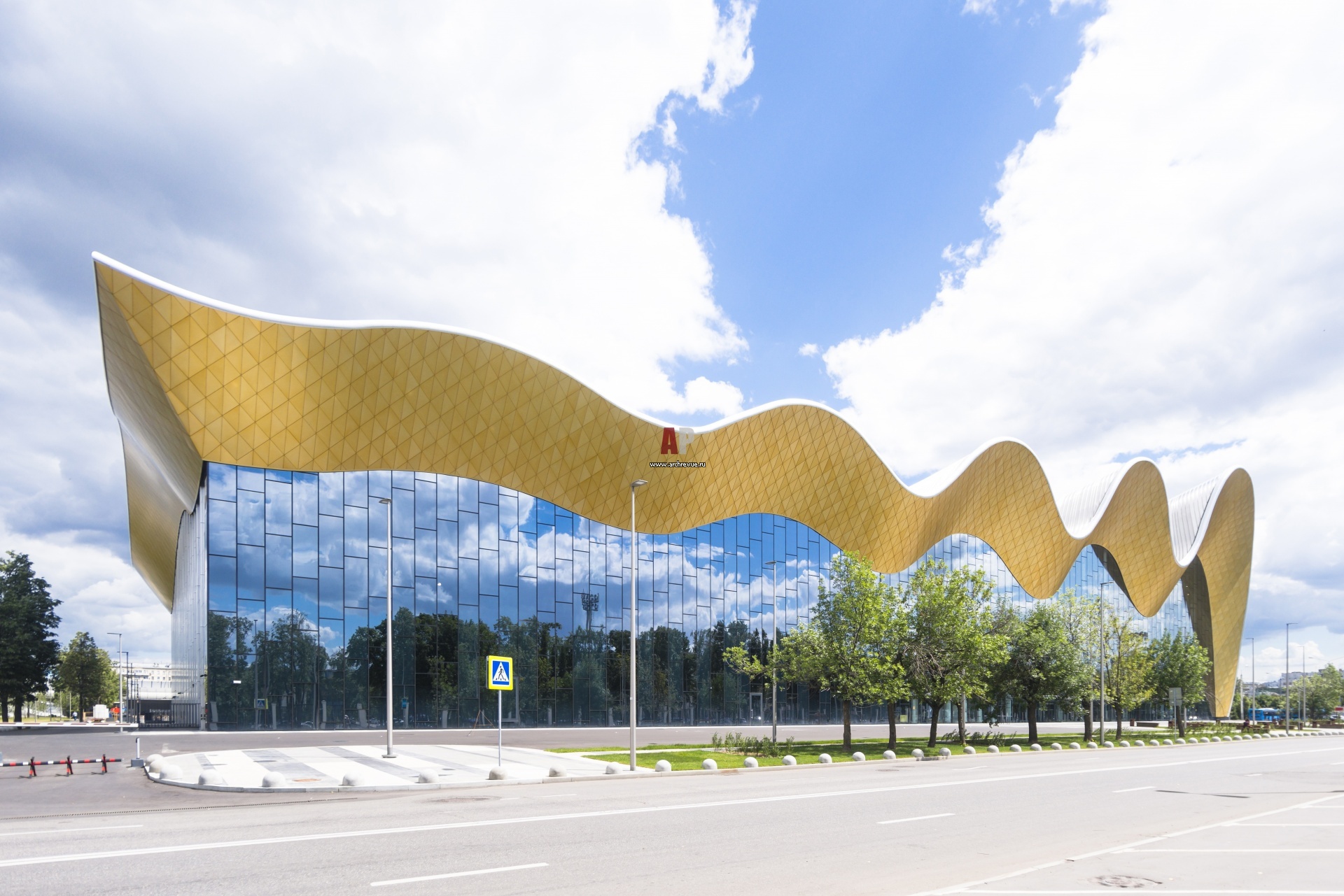 Главный фасад. Кровля имеет форму волны или гимнастической ленты. В качестве основного покрытия кровли общей площадью 15200 кв. м с двойным радиусом кривизны использованы алюминиевые панели разнообразной формы (прямые, конусные, радиусные) толщиной 0,8 мм.