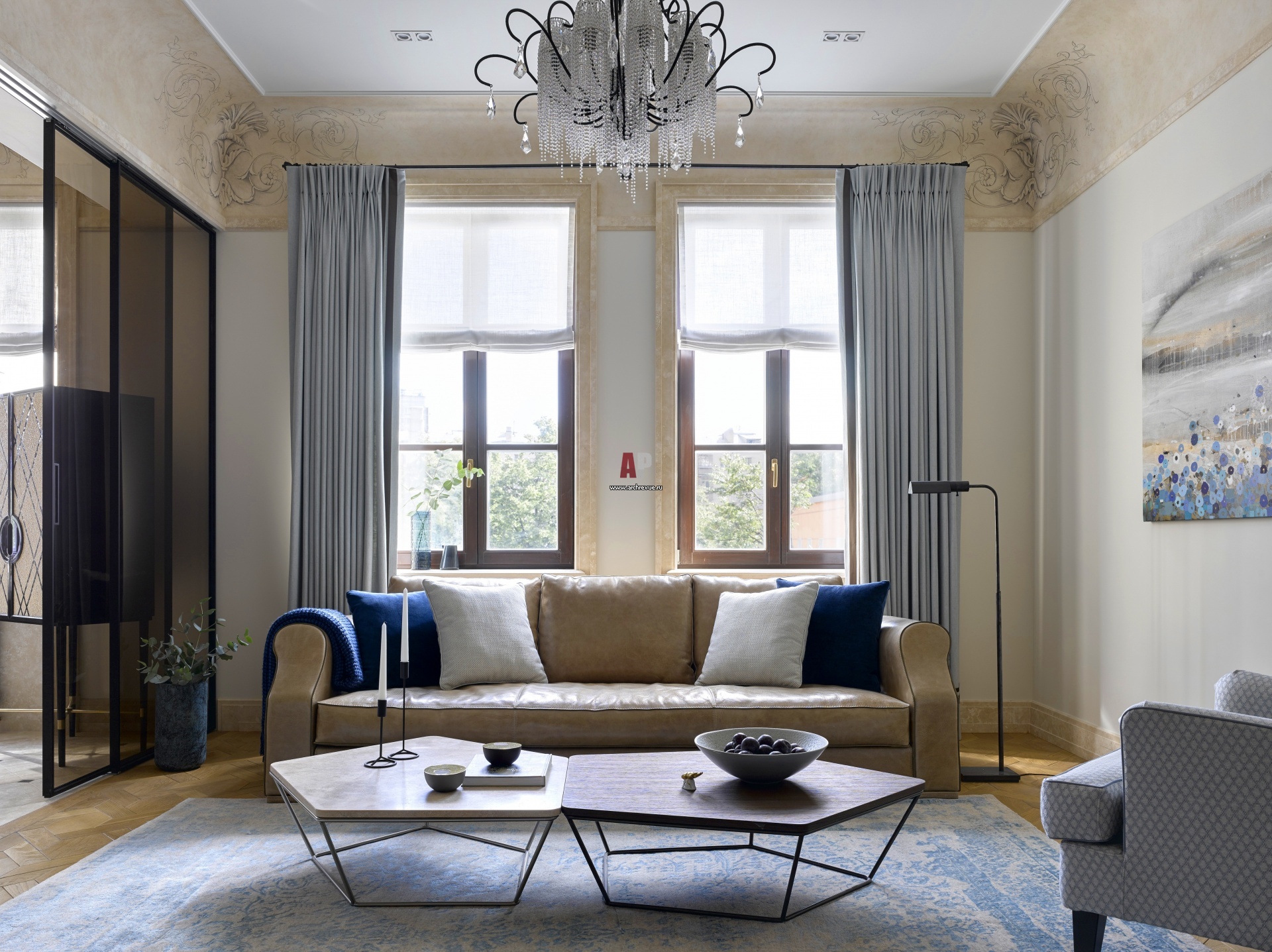 Сходство гостиной с классическими итальянскими виллами придает широкий карниз с ручной росписью, имитирующей лепной орнамент. Карниз оформлен декоративной штукатуркой с фактурой травертина, поверх нее нанесен тонкий, «эскизный» рисунок Роспись стен, художница Алла Кузьмина. Диван, Longhi. Журнальные столики, Natuzzi. Люстра, Patrizia Garganti.