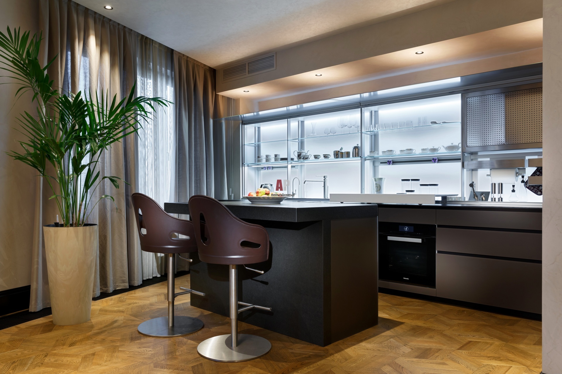 Интерьер кухни. Глянцевые фасады шкафчиков Valcucine цвета кофе с молоком сочетаются с теплой цветовой гаммой декоративной настенной штукатурки, имитирующей природный камень.