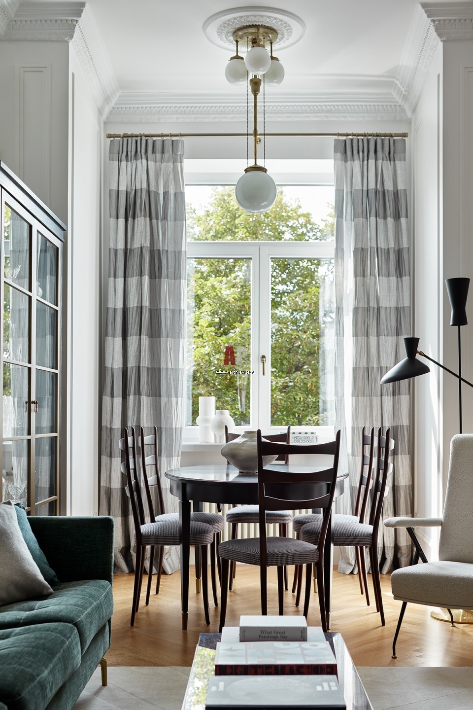 Столовая группа в гостиной. Лепные карнизы по периметру всех помещений – родная историческая гипсовая лепнина, реставрация. Стулья, винтаж. Стол, Dantone Home. Буфет, на заказ, по эскизам дизайнера. Люстра над столом, винтаж, 1957 год.