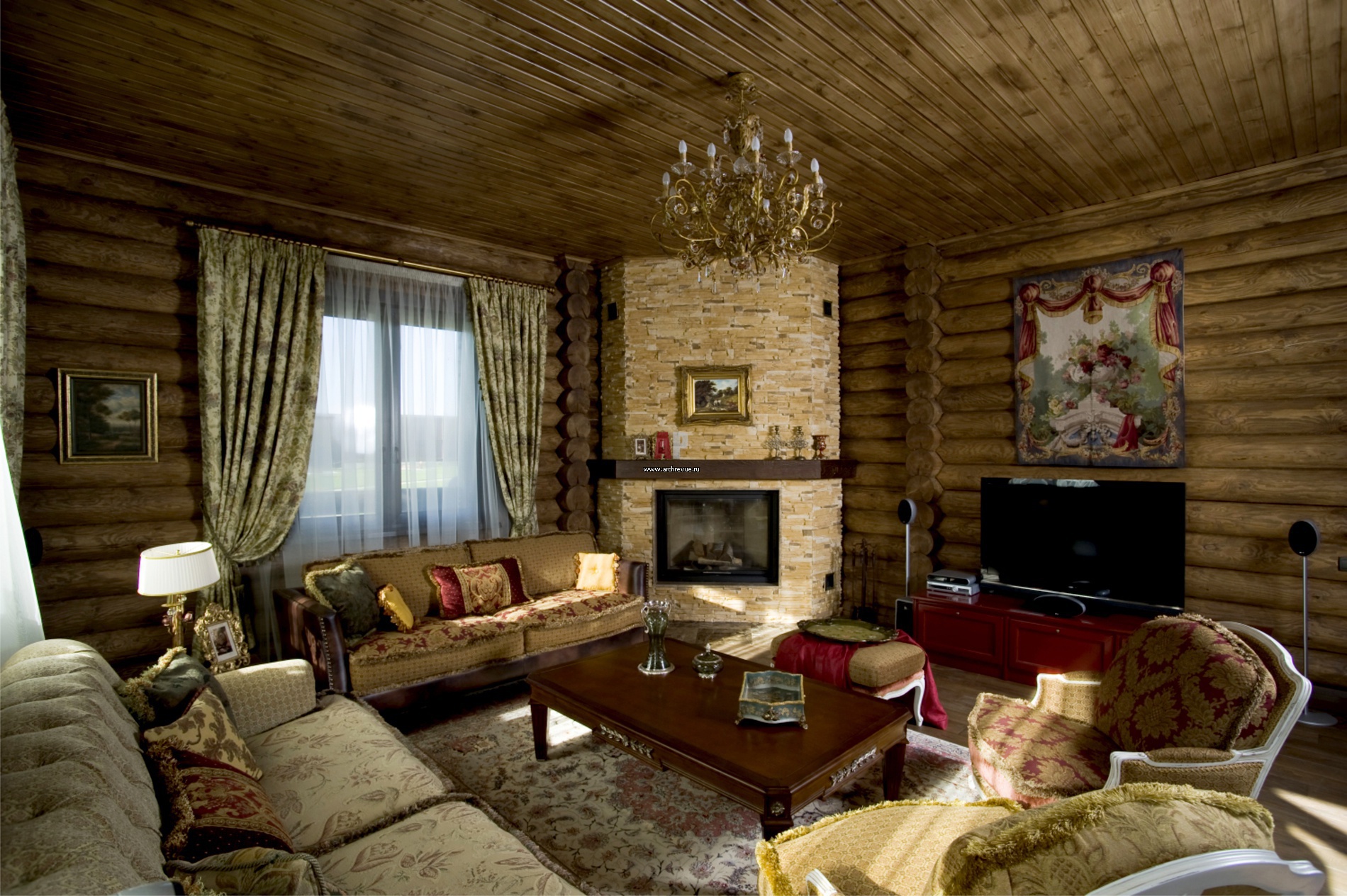 Зона гостиной. Дом сложен из белорусского бруса. Сосновые бревна оттонированы в цвет ореха.