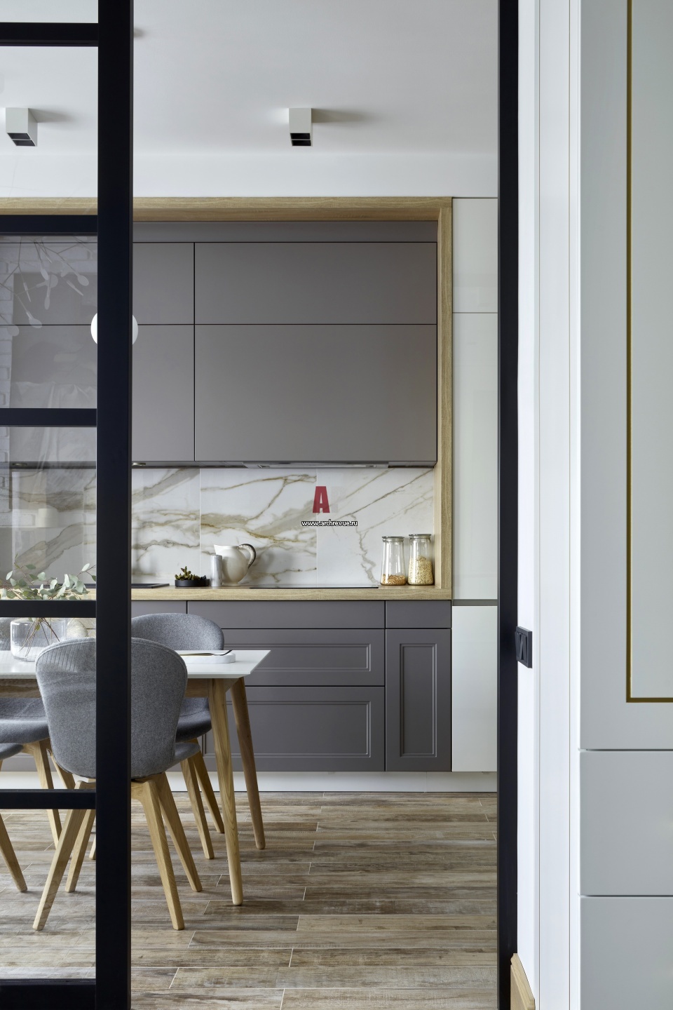Кухонный фартук оформлен керамогранитом Italon с фактурой мрамора Calacatta. На полу – плитка в виде деревянных плашек.