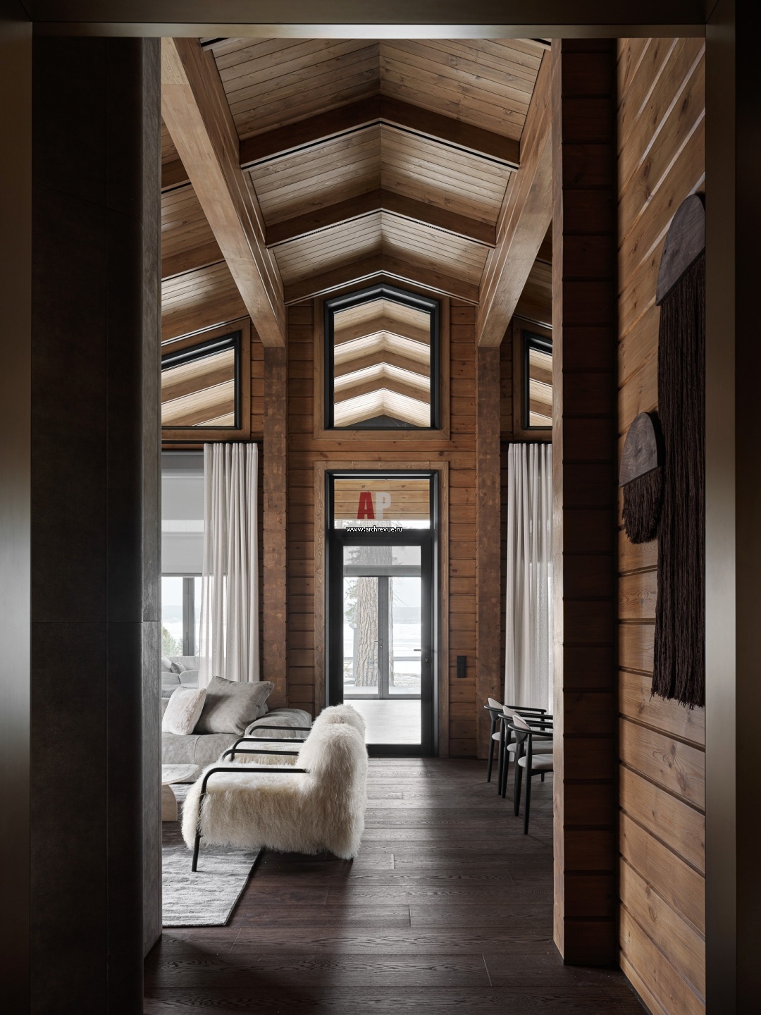 Современное шале возле лесного озера. Вид из прихожей на общую гостиную с великолепным панорамным остеклением.