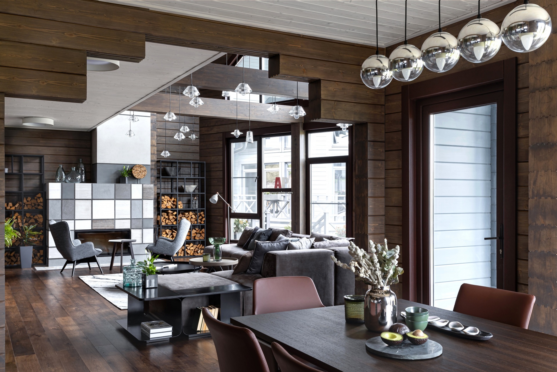 Центральное помещение первого этажа – гостиная со вторым светом, панорамными окнами и камином. Диван, кресла, Kare Design. Журнальные столики, Bontempi. Стеллажи и столики под книги выполнены на заказ. Светильники, Eglo.