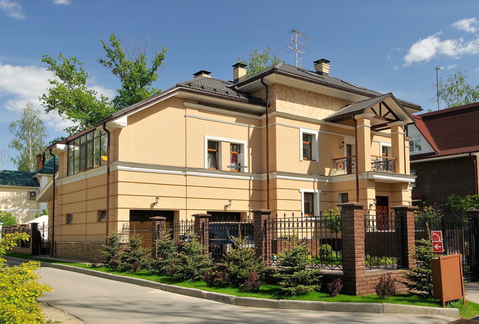 Главный фасад реконструированного дома в неоклассике. Кованое ограждение балкона с геометричным орнаментом, изготовление «Горн». Кровля выполнена из металлочерепицы.