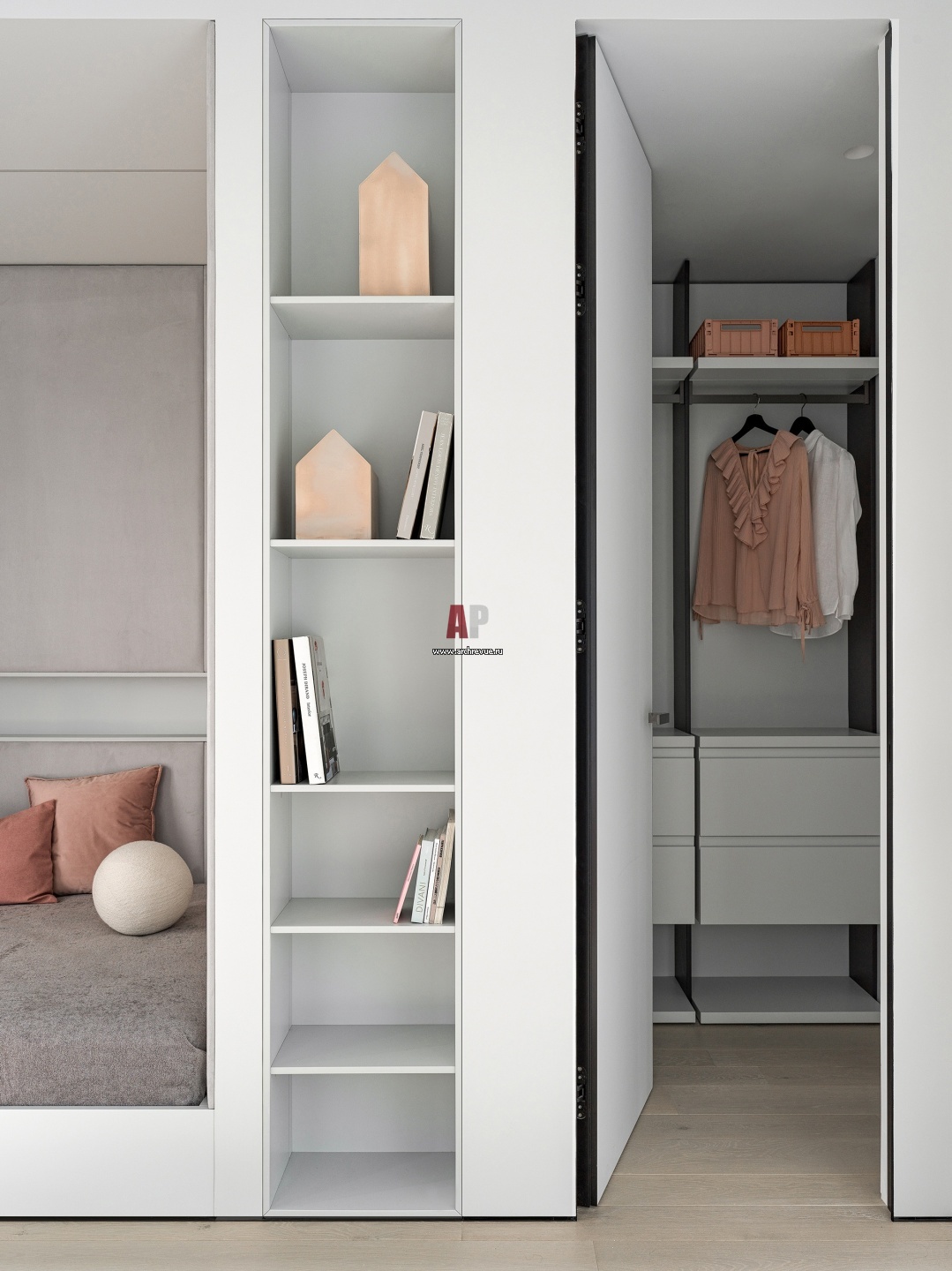 Гардеробная при комнате дочери. Для хранения одежды предусмотрена небольшая приватная гардеробная с проходом прямо из детской.