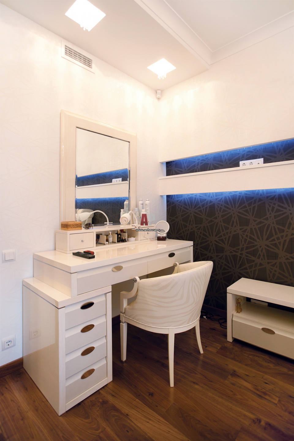 Зона будуара с туалетным столиком в спальне. Мебель в белом лаке.