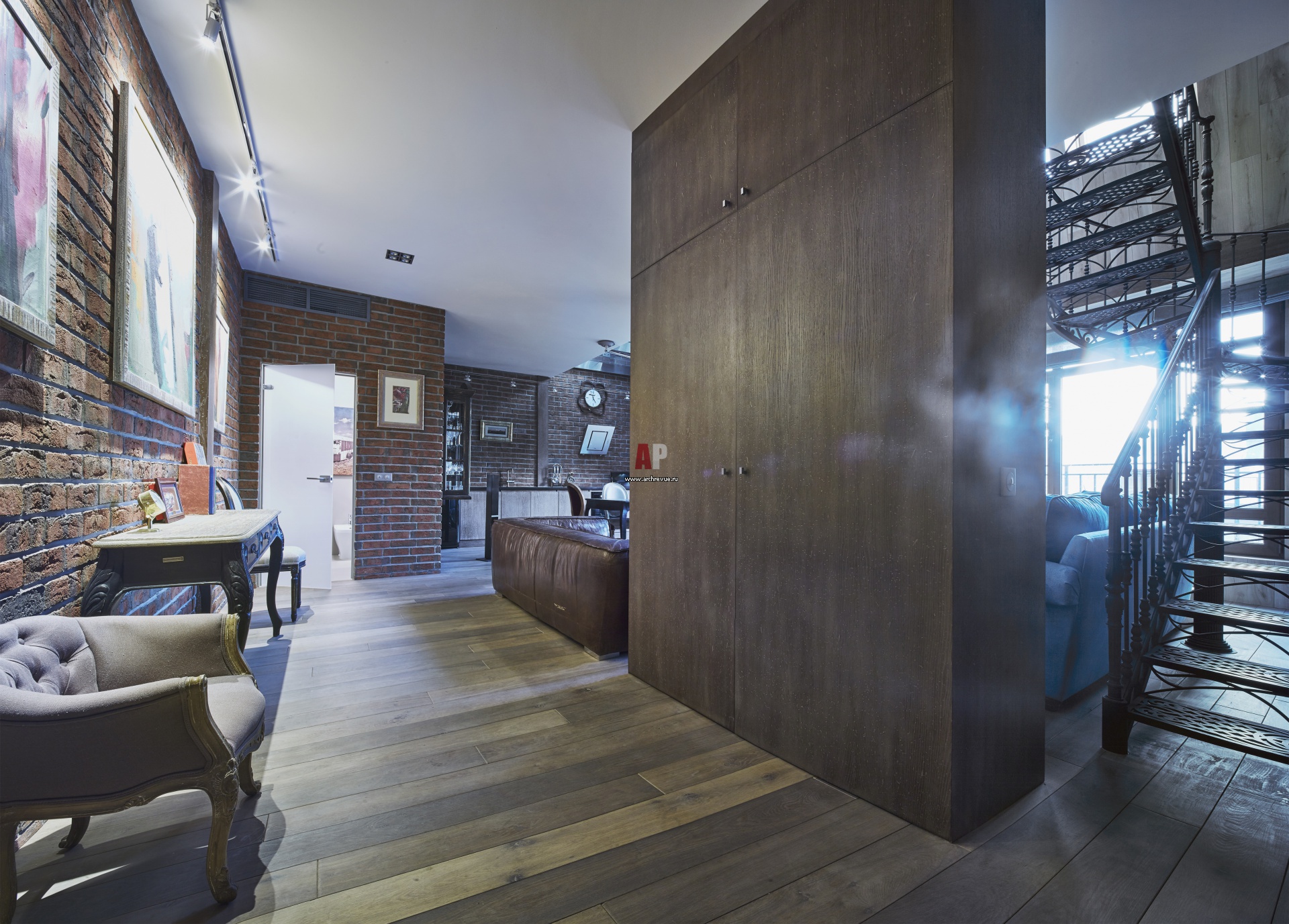 Важным элементом зонирования является гардеробный шкаф, который обозначает маршруты движения в квартире. Двустворчатый шкаф выполнен на заказ, изготовление «Бесст». МДФ, шпон дуба, фактура «винтаж».