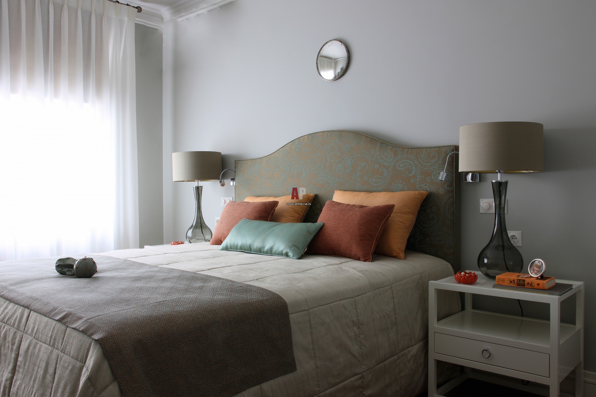 Цветовая палитра хозяйской спальни строится на нюансах серого, оливково-зеленых и теплых рыжих оттенков. Кровать, прикроватные тумбы выполнены по эскизам, «Мебельная линия Ирина Бубнова».