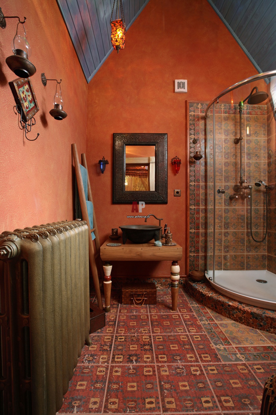 Интерьер восточного санузла в терракотовых и синих тонах. Глиняная керамика на стенах и полу.
