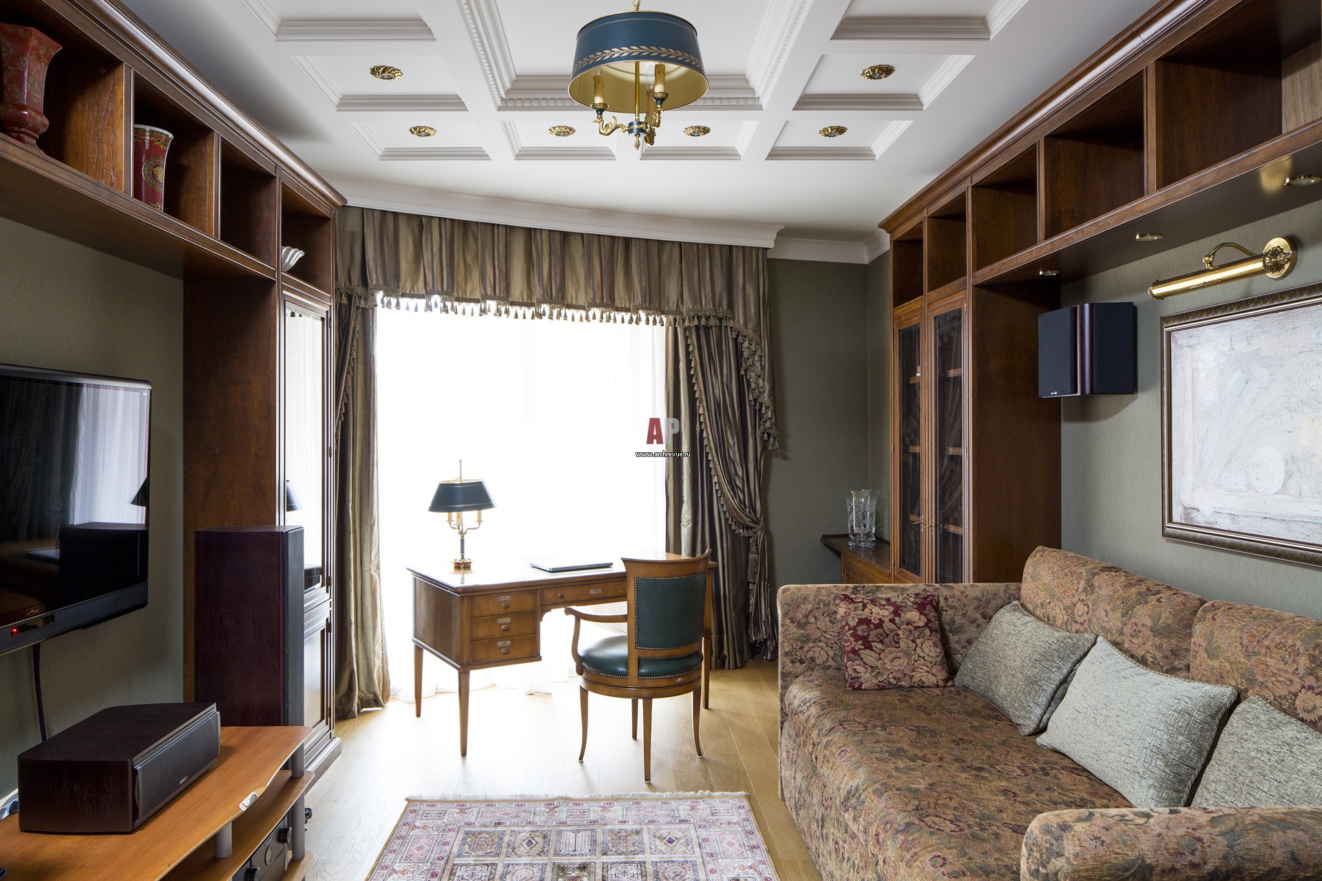 Мужской кабинет выполнен в плотной цветовой гамме. Кессонные потолки украшены лепниной с классическим орнаментом. Между библиотечными стеллажами от Luciano Zonta расположена телевизионная группа. Телевизор Metz – официальный дистрибьютор A&T Trade, аудиосистема Monitor Audio.