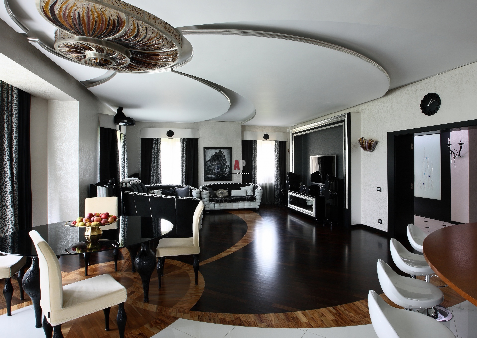 Дизайн интерьера двухэтажного дома вдохновлен формой радиусного потолочного светильника Наутилуса из цветного стекла. Его форма повторяется в отделке потолка, пола и плавных очертаниях мебели.