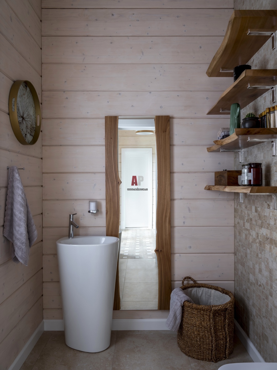 Интерьер гостевого санузла. Отдельно стоящая раковина, Laufen. Смеситель, Hansgrohe. Зеркало в полный рост и полки из слэба дерева, на заказ.