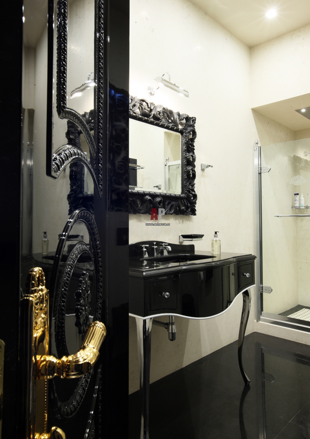 На фото – интерьер ванной комнаты в черно-белой гамме с глянцевыми поверхностями.