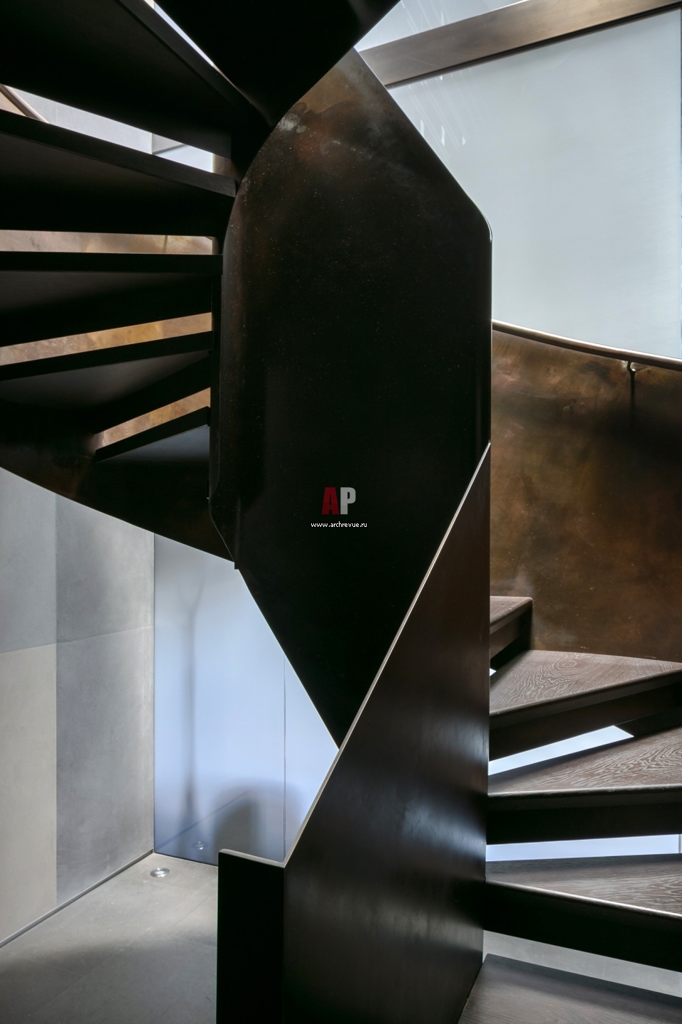 Полувинтовая лестница с деревянными ступенями на силовой металлической конструкции с цельнометаллическим ограждением (оно служит несущим элементом) изготовлена по индивидуальным эскизам.
