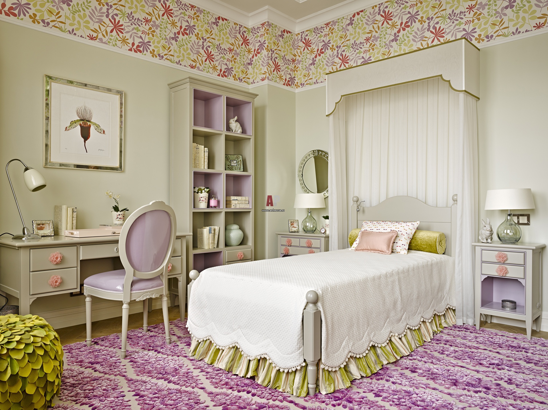 Интерьер детской комнаты оформлен в салатовых и розовых тонах. На фоне однотонных пастельных стен эффектно смотрится широкий карниз из обоев с орнаментом, Jane Churchill. Мебель для детской, Halley.