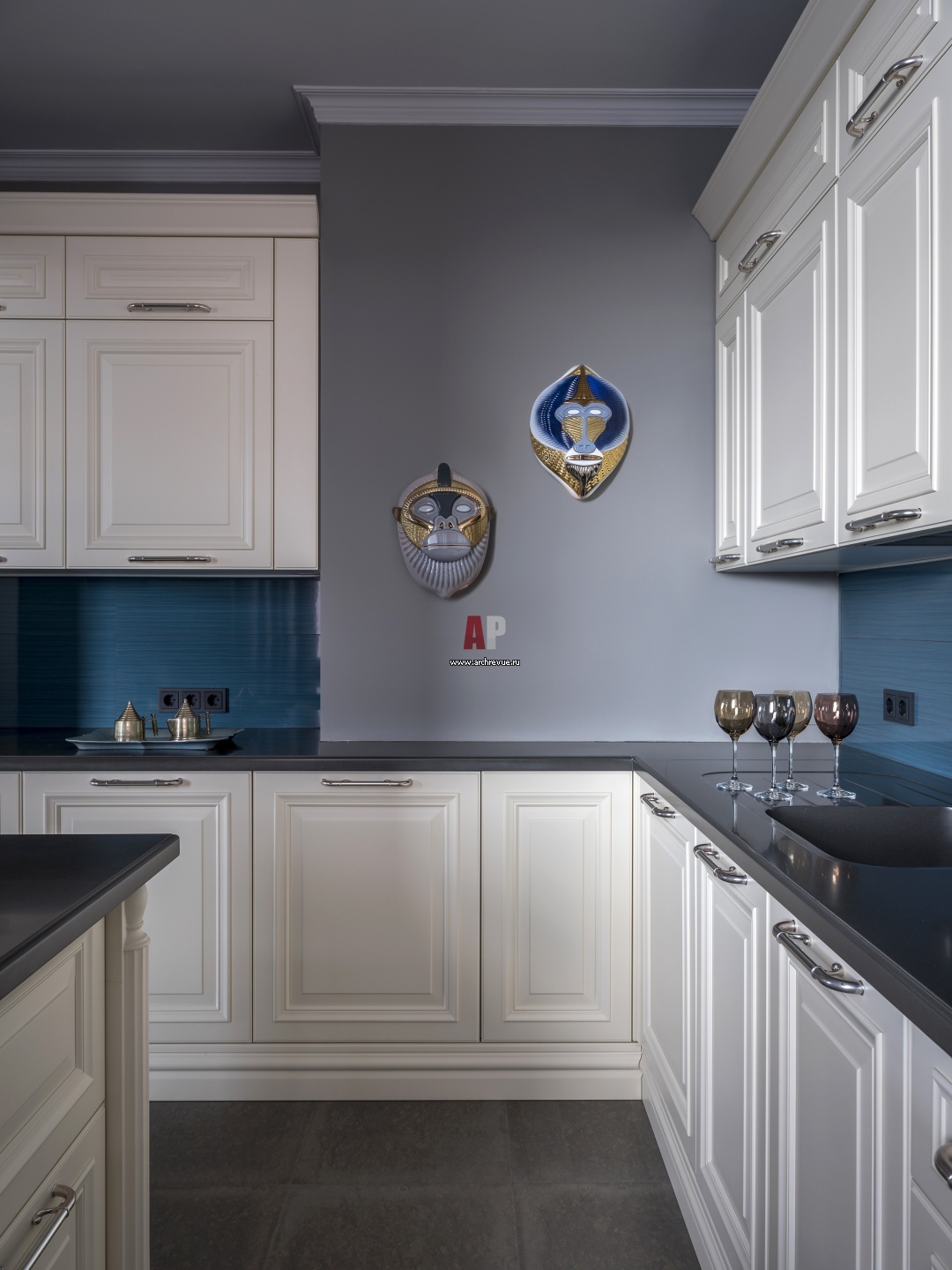 Мужская квартира с бирюзовыми стенами. Интерьер кухни.