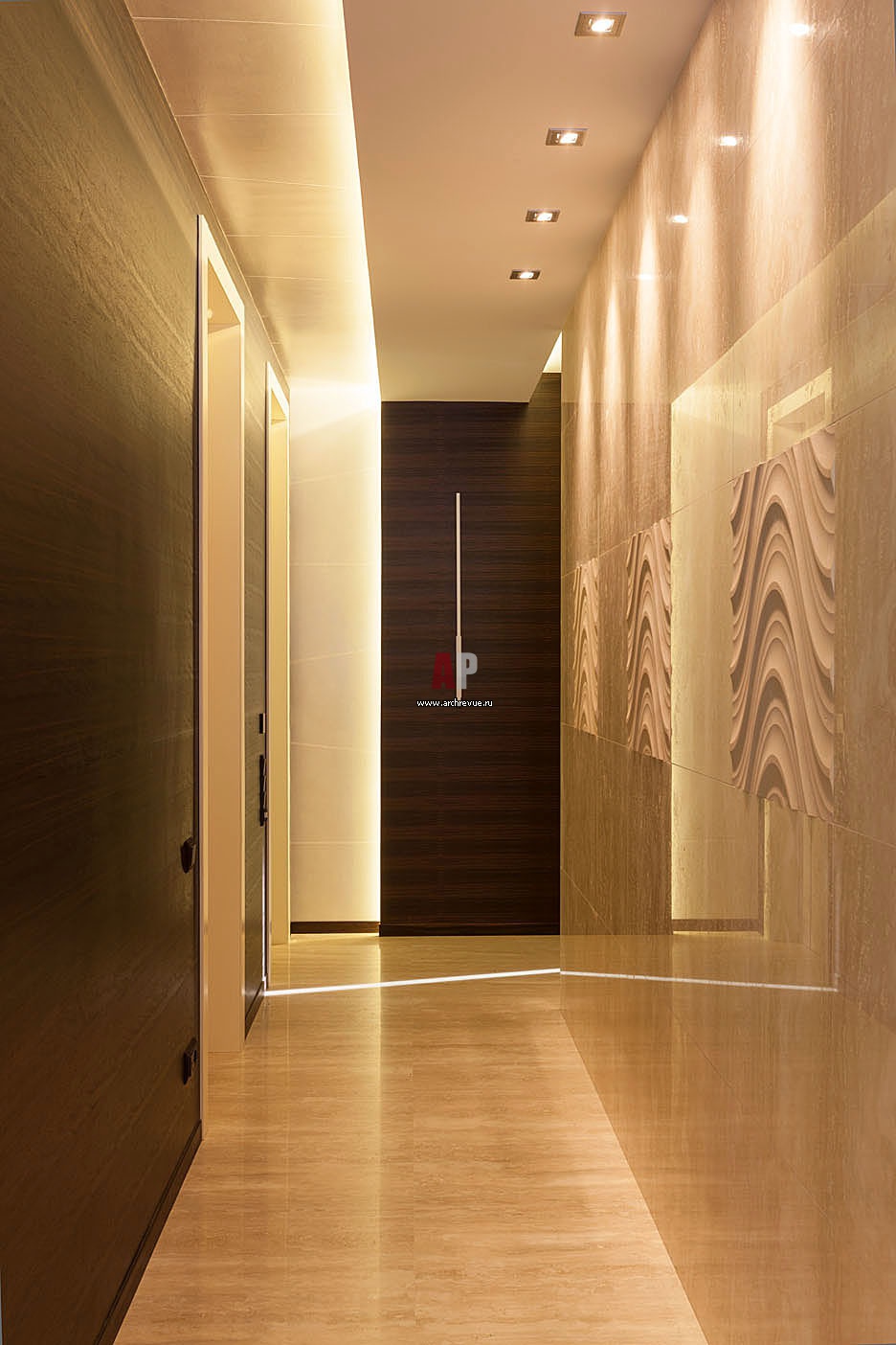 Фото интерьера коридора в природной цветовой гамме. Одна стена зашита панелями из эбенового дерева, из него же сделаны межкомнатные двери, другая – облицована камнем рельефом, напоминающим барханы в пустыне.
