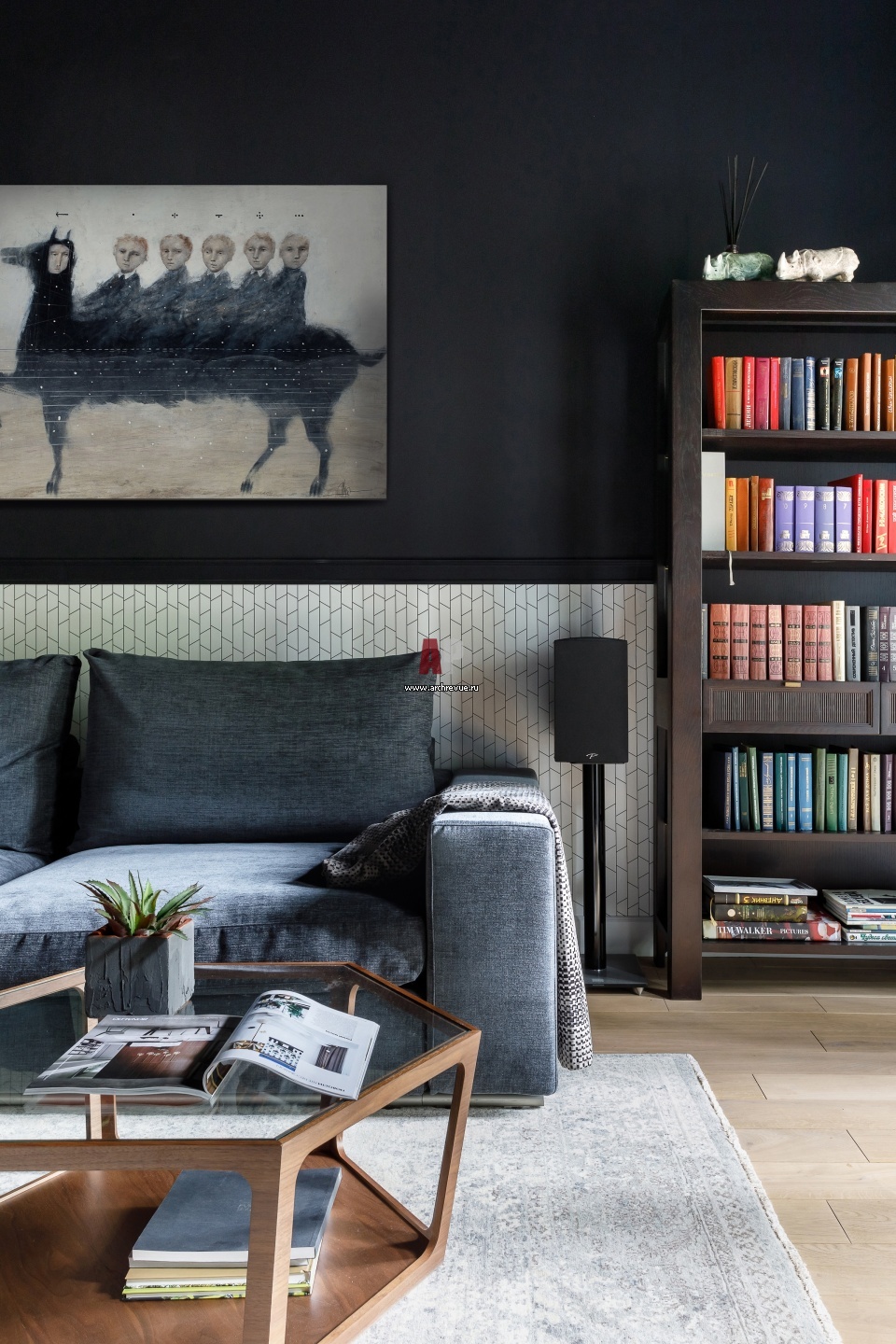 Кабинет в черной палитре. Нижняя часть стены – обои, Engblad & Co, коллекция Graphic World. Диван, Flexform. Стеллаж, Bamax. Картина Алексея Теренина.