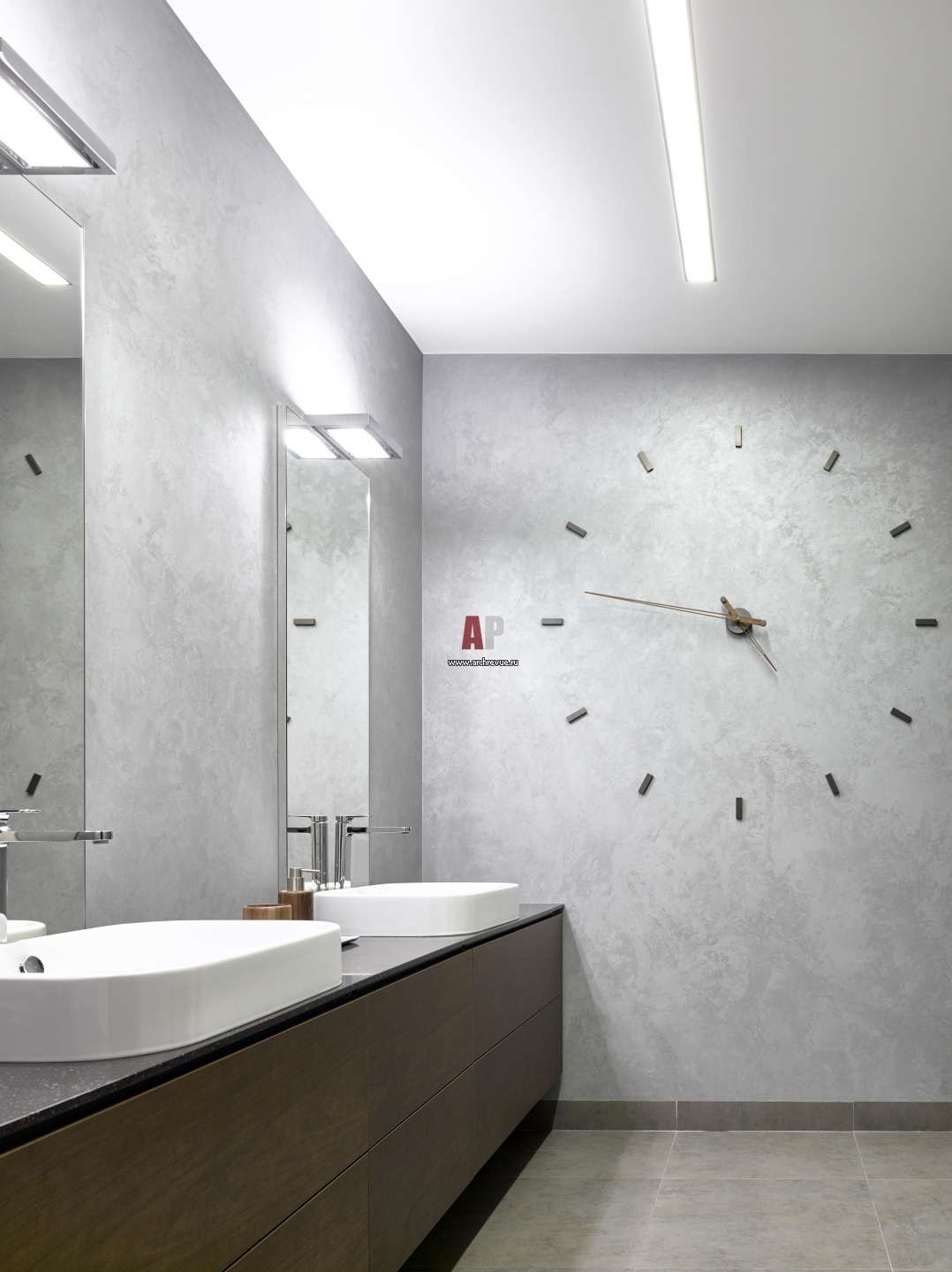 Детский санузел. Стены декорированы фактурой «под камень», с приятным тактильным эффектом. На полу – керамогранит. Тумба под умывальник, накладные раковины, Duravit. Смесители, Fantini. Часы на стене, Nomon.