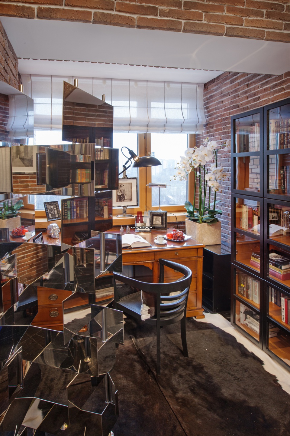 Фото интерьера кабинета в небольшой проходной комнате. Оригинальная ширма из металла от Now`s Home зонирует пространство, преломляет свет и зрительно усложняет помещение.