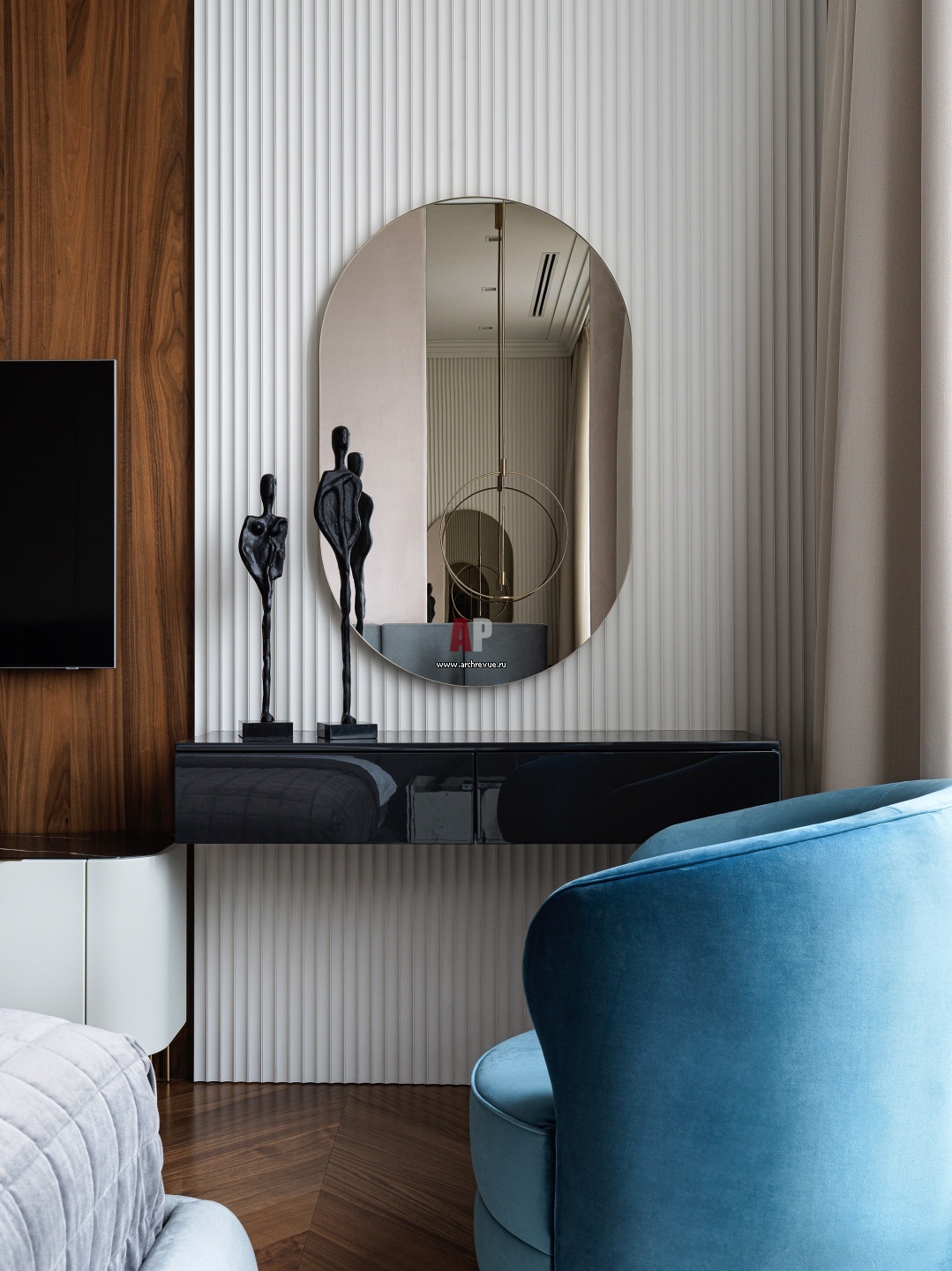 Современный туалетный столик с зеркалом в спальне.