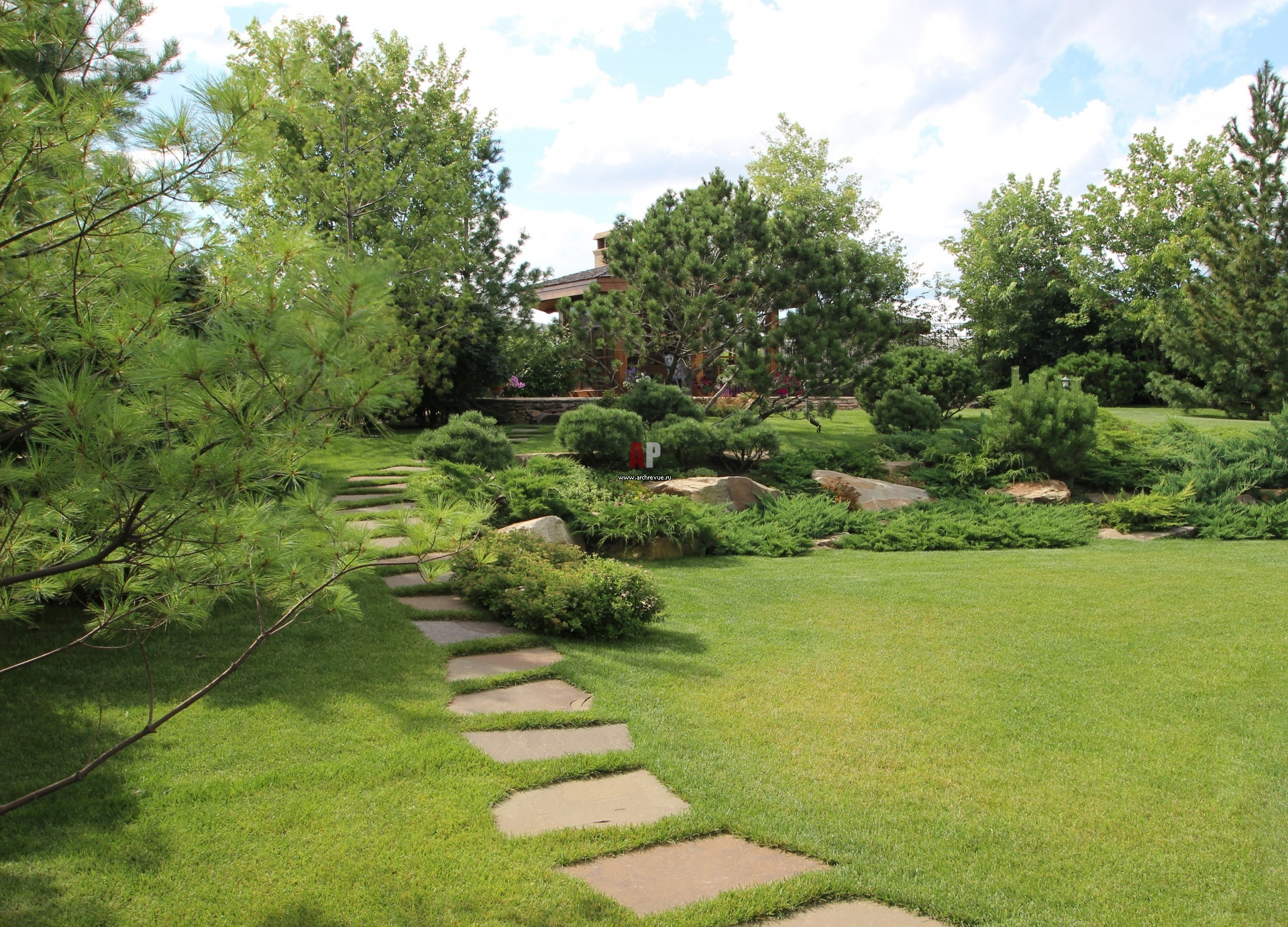 Дорожки вымощены массивными плитами песчаника (длиной 70-90 см и толщиной – не меньше 60 мм). Каменные плиты «утоплены» в газон и выглядят естественно.