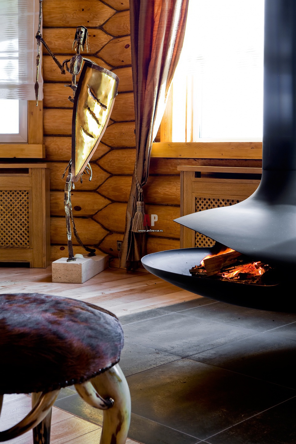 С патинированной бревенчатой кладкой сочетается половая доска из древесины платана. Торшер GB NUove Linee Bagno.