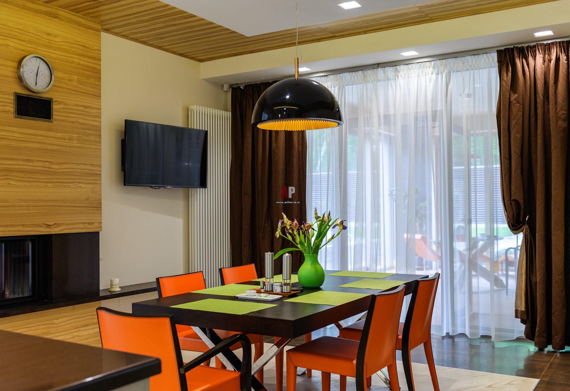 Фото интерьера столовой группы. Через стеклянные раздвижные двери из столовой можно попасть на террасу, оборудованную под летнюю кухню. Стулья из оранжевой кожи. Дымоход камина и периметр потолка подшиты деревом.