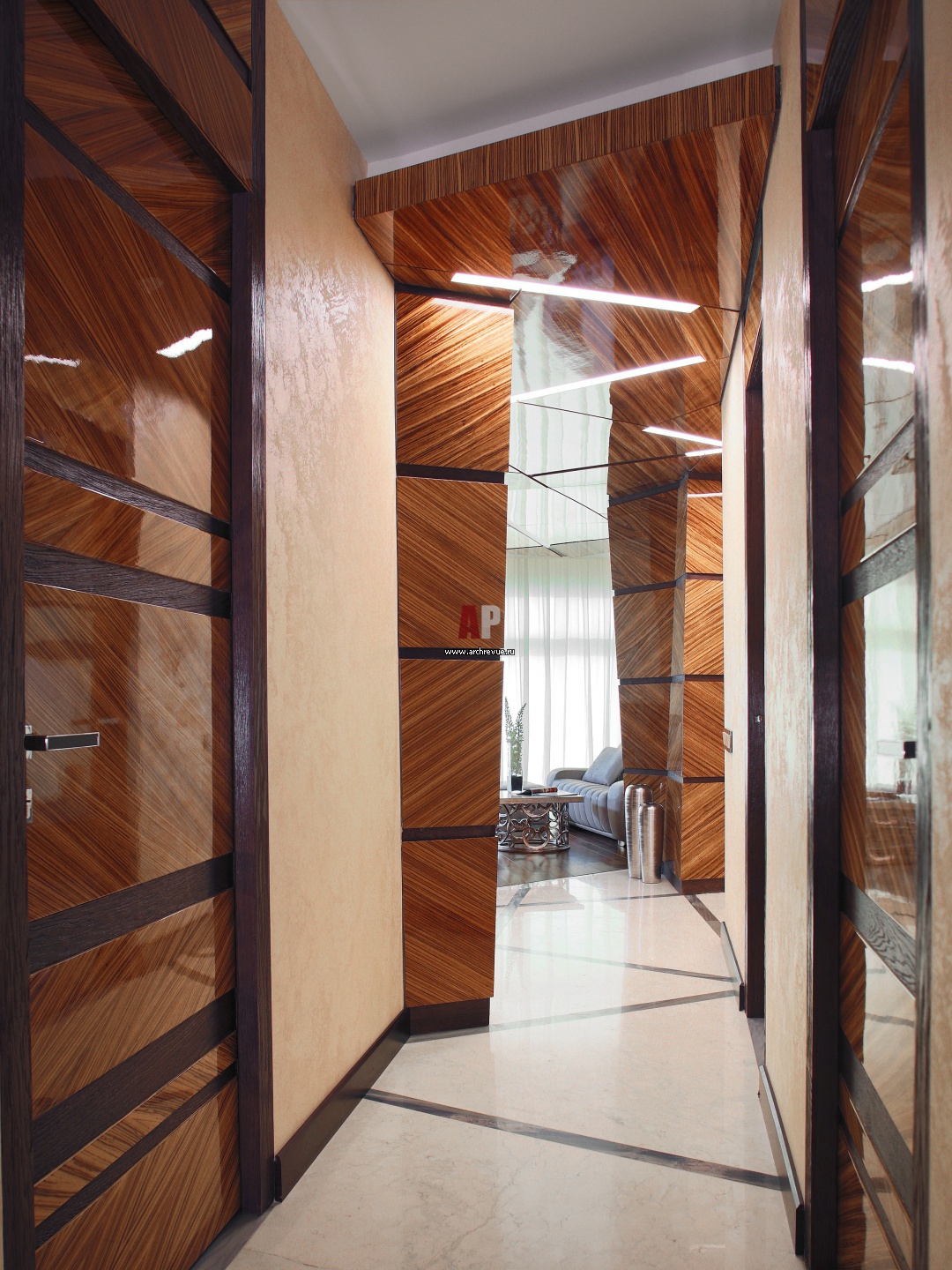 Фото интерьера холла салона красоты. Панели, шпон зебрано, рояльный лак.