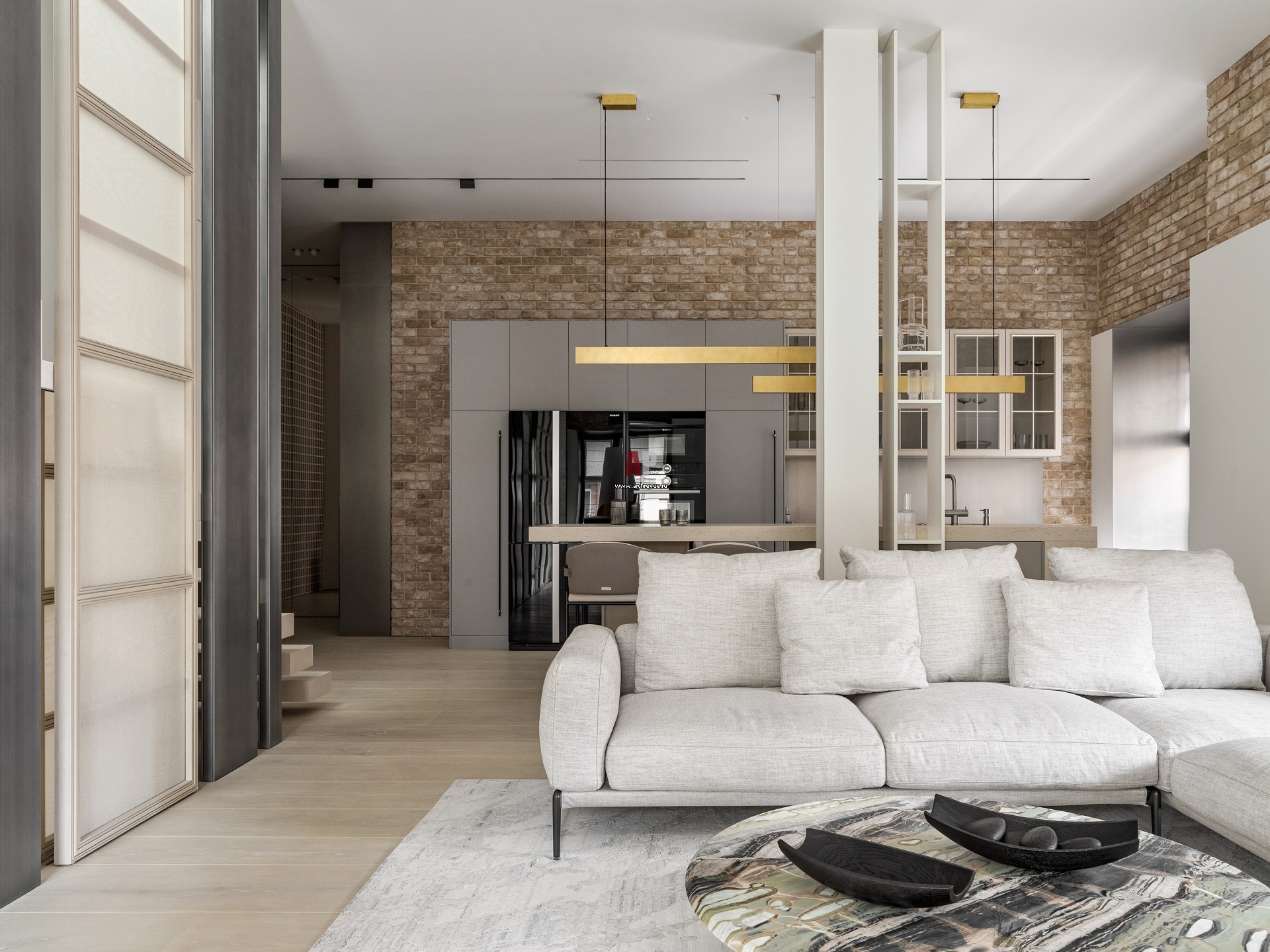 Кухня-гостиная. Гостиная. В отделке стен использована матовая краска. На потолке – суперматовая, Little Greene, номер 236 flint. Это очень нежный молочный оттенок с примесью жемчужного холодного тона, благодаря которому интерьер выглядит нейтрально и мимикрирует в пространстве.