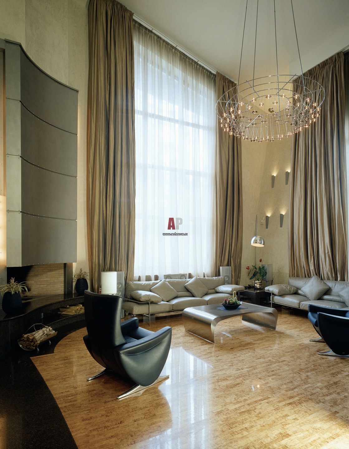 Камин сделан строительным методом. Пластичной формы дымоход выглядит как часть стены. Он выполнен из гнутого металла.