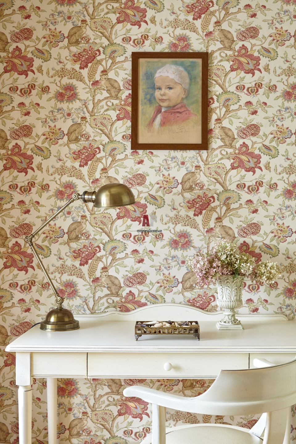 Интерьер детской исполнен в коралловых тонах. Обои с цветочным орнаментом на белом фоне, Decor Delux. Рабочий стол, Siguier. Стул, AM Classic. Настольная лампа, Eichholtz.